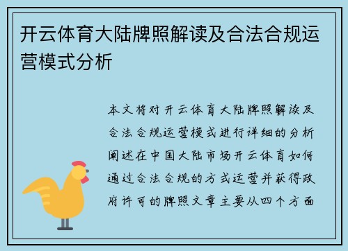 本文将对开云体育大陆牌照解读及合法合规运营模式进行详细的分析,阐述在中国大陆市场开云体育如何通过合法合规的方式运营,并获得政府许可的牌照。文章主要从四个方面进行深入探讨:首先分析开云体育大陆牌照的背景及申请流程;其次探讨开云体育在合法合规运营方面所面临的政策环境与监管挑战;接着详细分析开云体育的合法合规运营模式及其盈利方式;最后对开云体育未来在大陆市场的运营前景进行展望。通过这些方面的详细分析,本文将为读者提供清晰的理解,帮助他们掌握开云体育在大陆市场的法律框架与合规运营策略。